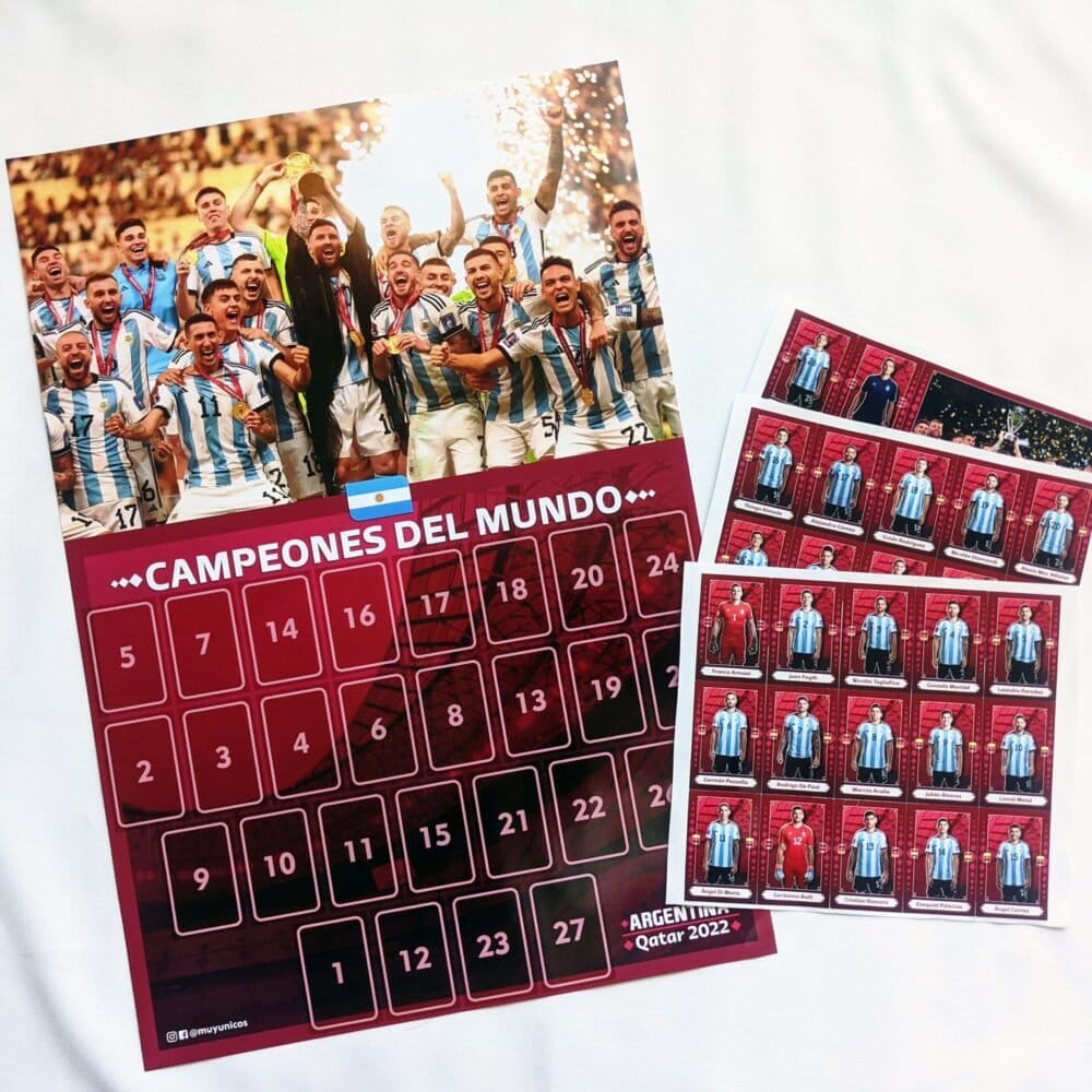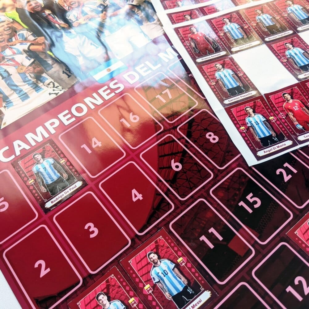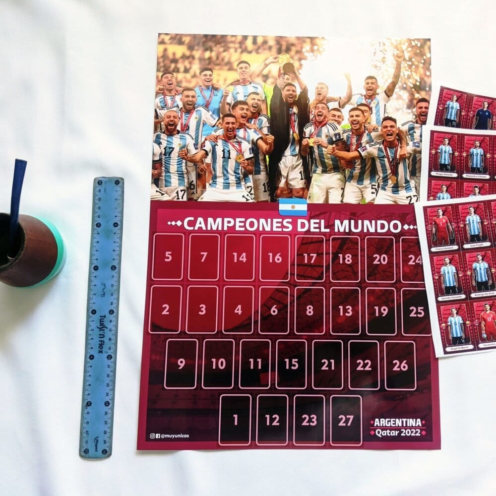 ¡Es el momento de recordar al nuevo ganador de la Copa Mundial 2022! Kit conmemorativo de celebración con todos los cromos del ganador del mundial: ¡Argentina! Incluye: 1 poster y 28 cromos para festejar a la Selección Argentina, a todos los jugadores y al mejor momento de este maravilloso logro! Medidas del poster: 33cm x 49cm