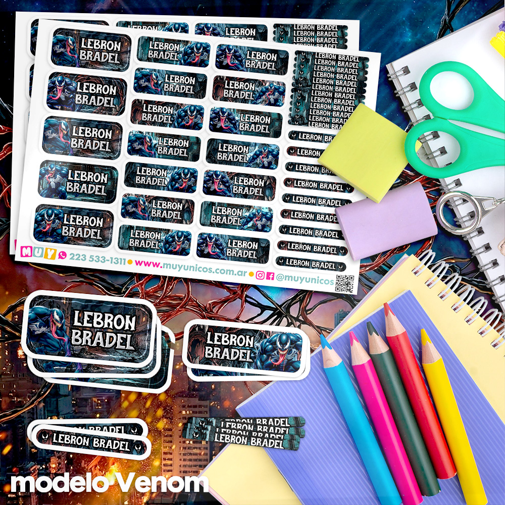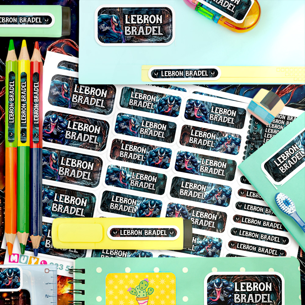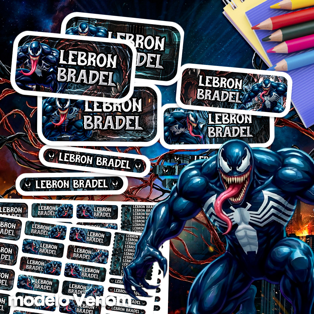 Dejá que el simbionte tome el control de tus útiles con estas etiquetas de Venom, el antihéroe de Marvel con la lengua más icónica del universo de los cómics que mezcla oscuridad, poder y carisma en partes iguales. Ideales para identificar cuadernos, libros, mochilas, cartucheras y loncheras, personalizadas con tu nombre en un diseño negro intenso que captura los colmillos, los ojos blancos y la amenaza simbionte de Eddie Brock en su forma más impactante.